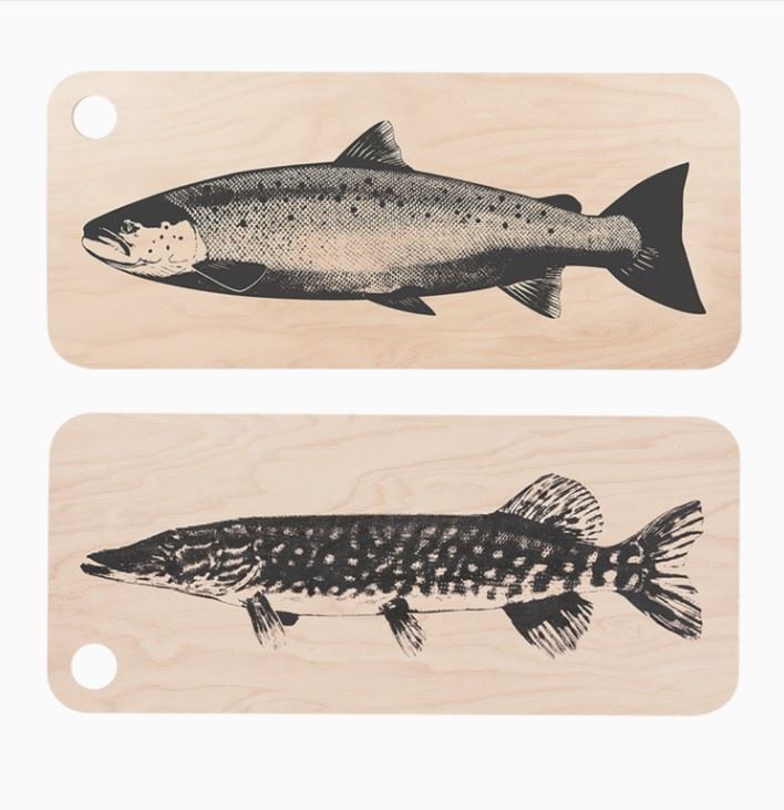 Schneide- und Servierbrett mit Lachs & Hecht Motiv in Schwarz-Natur aus Birkenfurnier mit Melaminbesichtung, Grösse 20x46cm. Geschirrspühler geeignet.