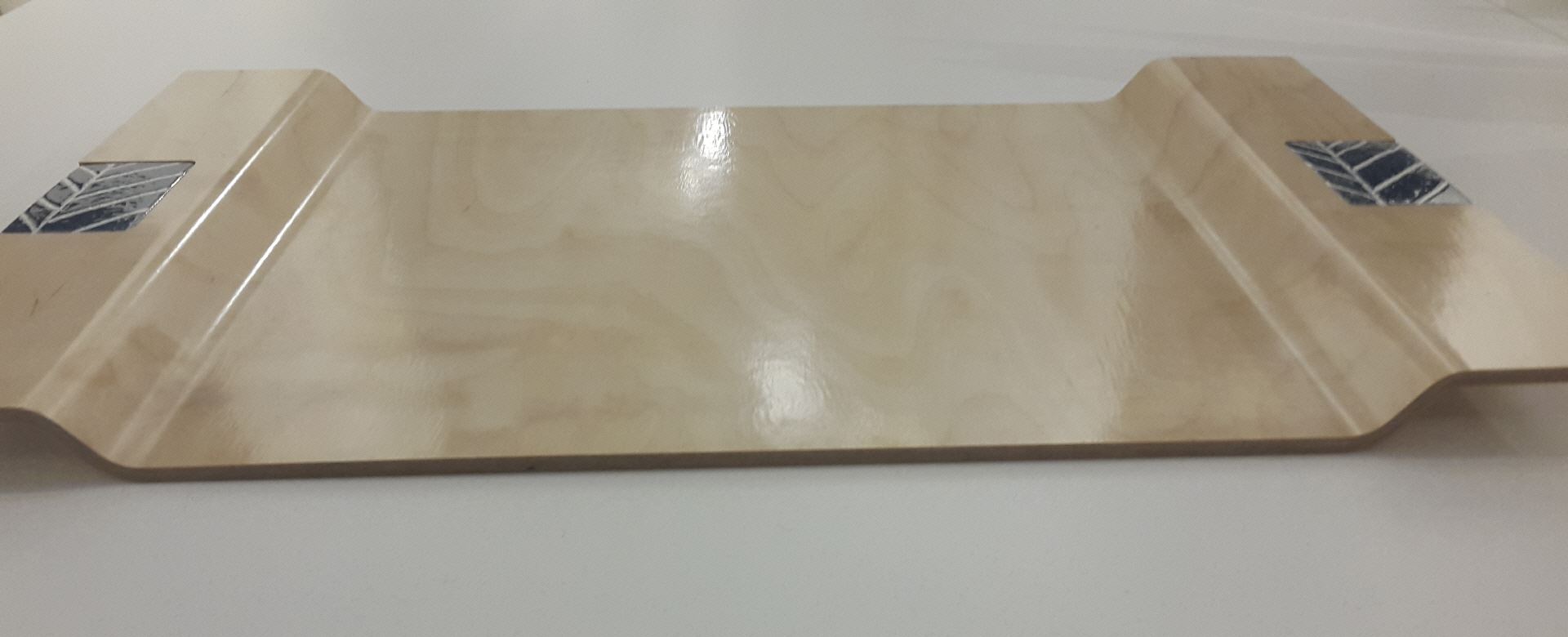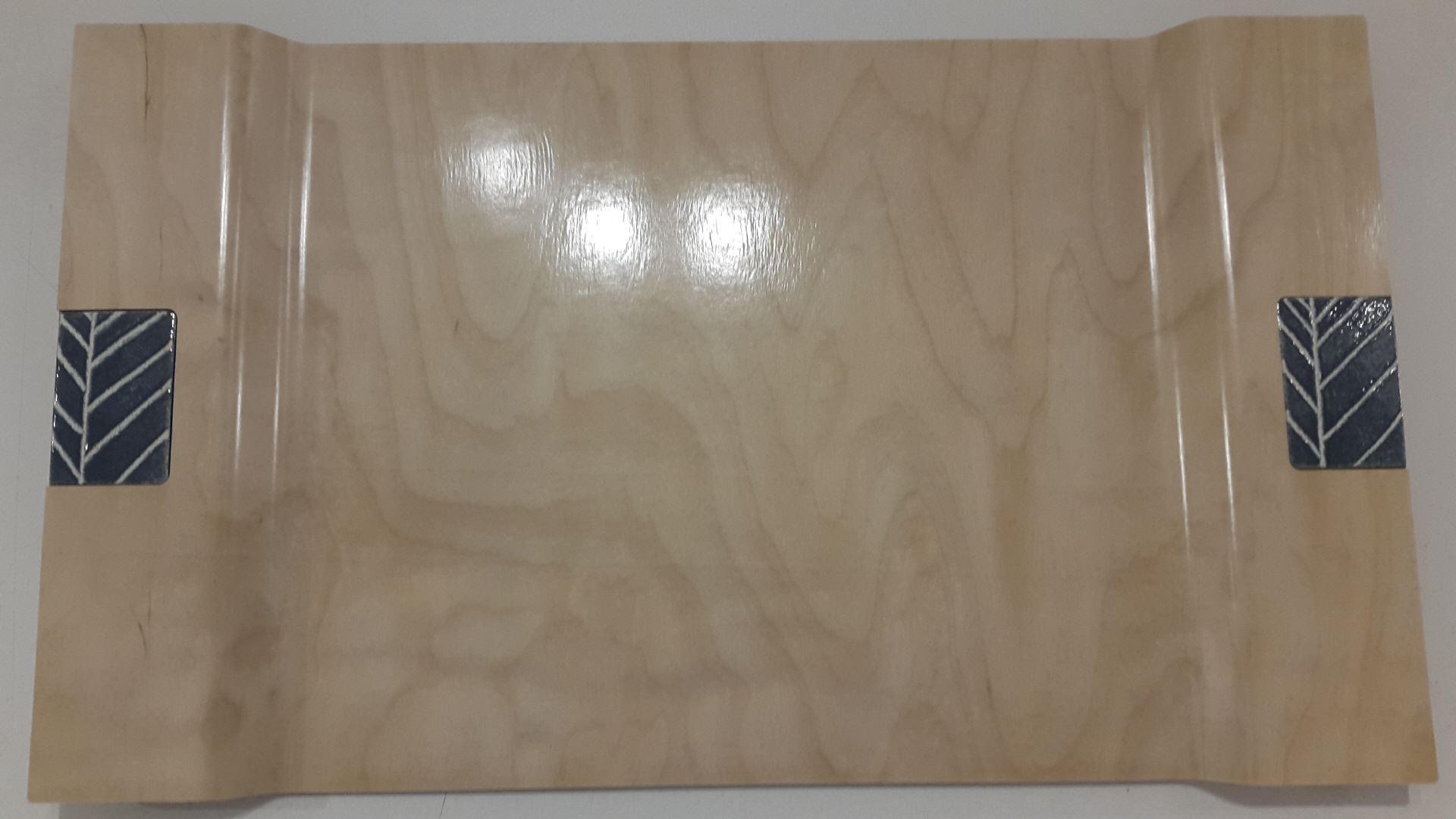 Handgemachter Holztablett aus Birkenholz mit Emailbesatz von Pauliina Rundgren Design. Hochgezogene, geformte Handgriffe. Aus einem Stück Birkenfurnier. Grösse 26.5x46.5x2cm. Handgriffbreite 6cm. Handwasch.