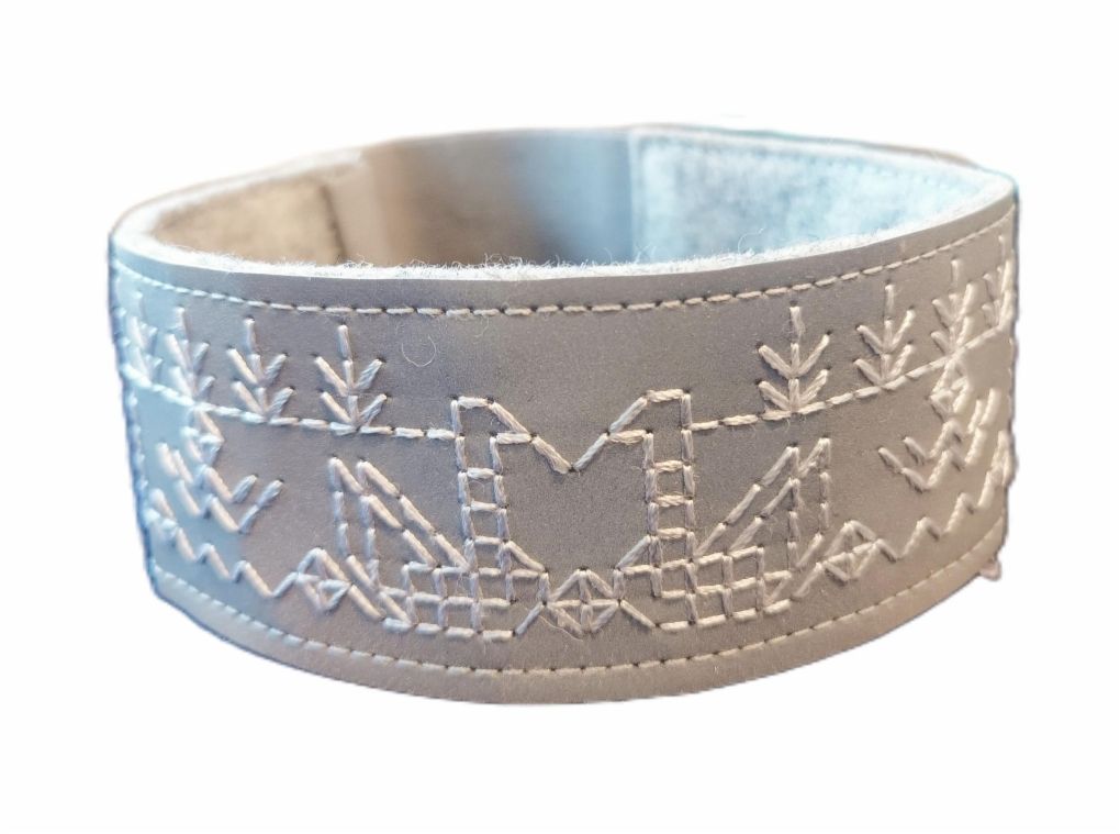Stickerei Weiss. Das Gummiband des Reflektorarmbandes erleichtert das Tragen und Anbringen. Die Breite des Armbandes beträgt 8 cm und die Länge des Armbands 26 (=Grösse S) cm, 29 cm (=Grösse M) & 32cm (=Grösse L). Das Stickereimuster kann kleine Abweichungen vom Bild vorweisen.
