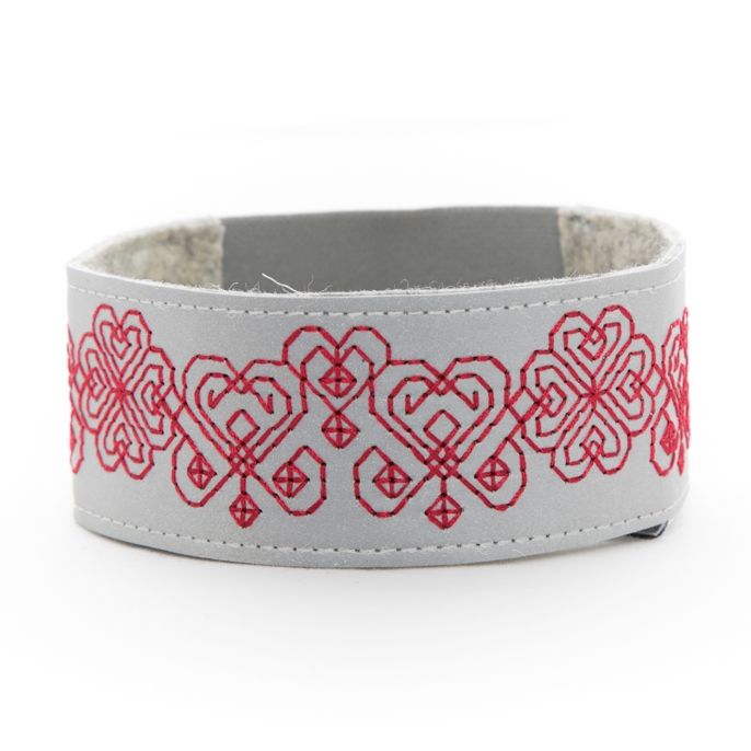 Stickerei Rot. Das Gummiband des Reflektorarmbandes erleichtert das Tragen und Anbringen. Die Breite des Armbandes beträgt 8 cm und die Länge des Armbands 26 (=Grösse S) cm, 29 cm (=Grösse M) & 32cm (=Grösse L). Das Stickereimuster kann kleine Abweichungen vom Bild vorweisen.