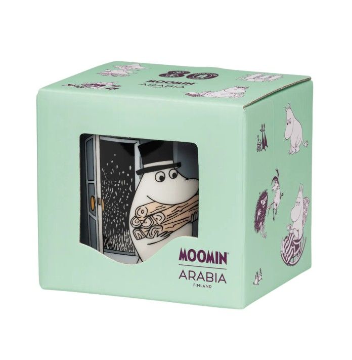 Auf dem grauen Mumin-Becher aus der Mumin-Klassiker-Kollektion bereitet Muminpapa das Muminhaus auf den Winter vor, damit die Familie während ihres Winterschlafs warm bleibt. Die Kälte bleibt draußen und die Wärme drinnen, wenn die Fenster mit Brettern isoliert sind und genügend Brennholz vorhanden ist. Muminpapa, der sich oft nach Abenteuern sehnt und Geschichten von den mutigen Reisen seiner Jugend erzählt, ist auch ein hingebungsvoller Familienmumin, der stets sein Bestes gibt, um seine Pflichten zu erfüllen.