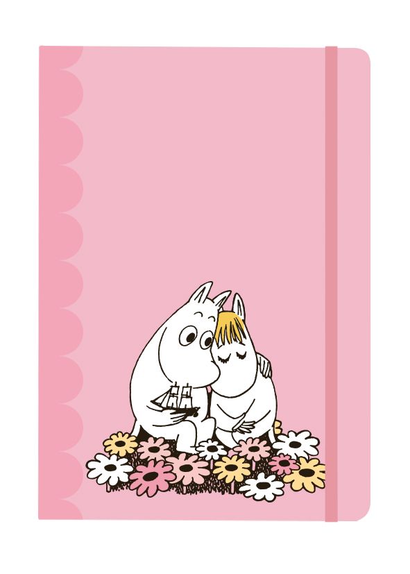 Notizbuch mit Softcover und Mumin-Illustrationen. Das Cover hat einen rosa Hintergrund und ein Bild von Mumin und Snorkfräulein, die sich inmitten von Blumen umarmen. Das Notizbuch hat farbige Innendeckel und 128 leere, weisse Seiten und einen Gummibandverschluss. Papierqualität 100 g/m². Größe A5. © Mumin-Figuren™