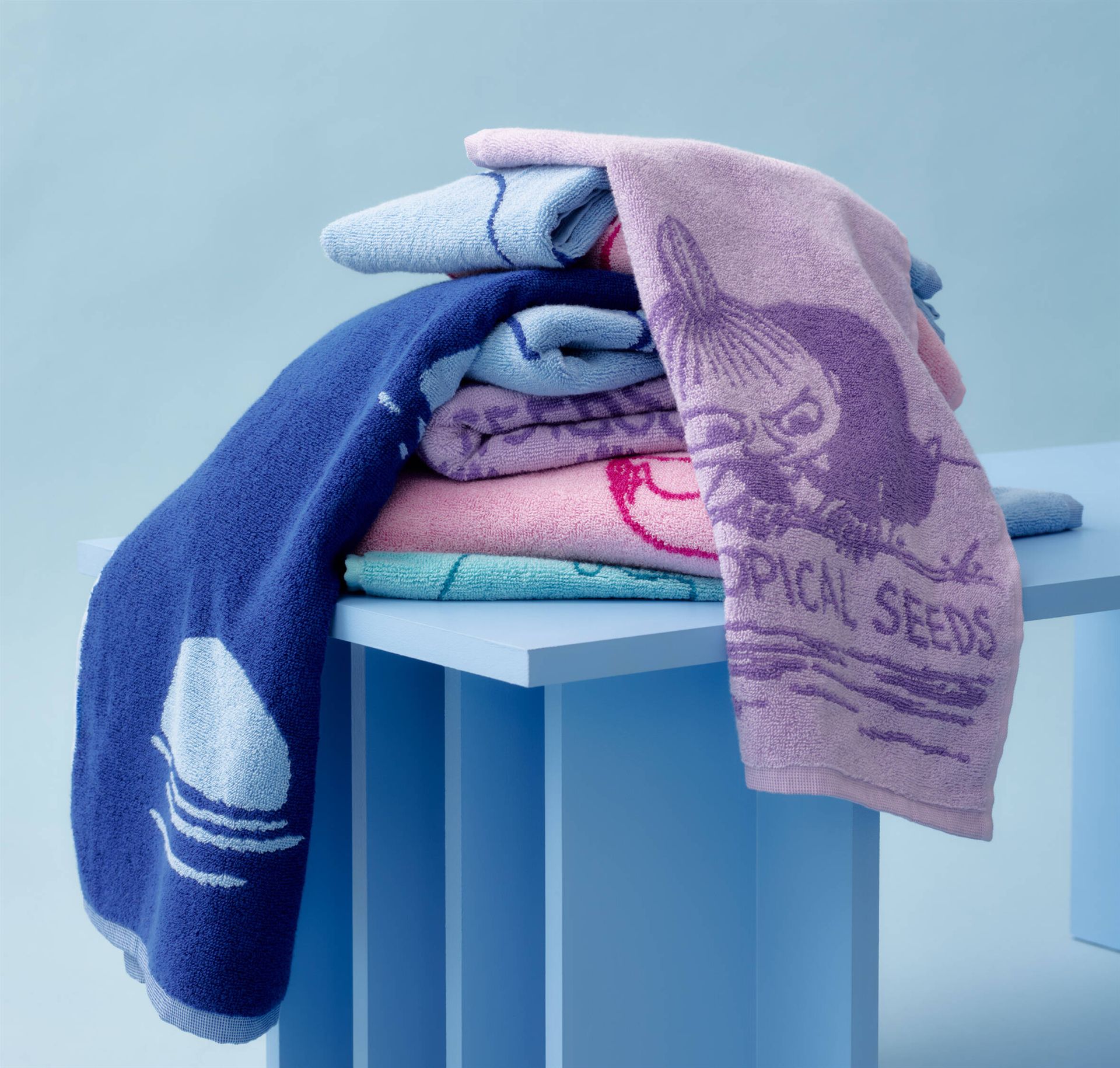 Geniessen Sie die weiche Gemütlichkeit eines lilafarbenen Mumin-Handtuchs aus Bio-Baumwolle mit der temperamentvollen Kleine My.