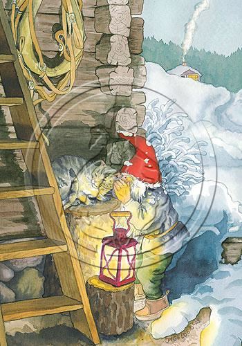 Inge Löök Weihnachtskarte "Wichtel teilt ein Geheimnis mit Katze"