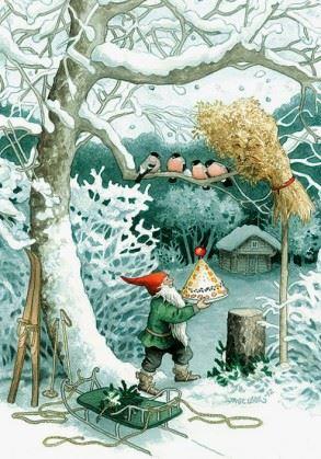 Inge Löök Weihnachtskarte "Wichtel füttert Dompfaff"