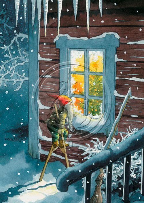 Inge Löök Weihnachtskarte "Wichtel vor dem Fenster"