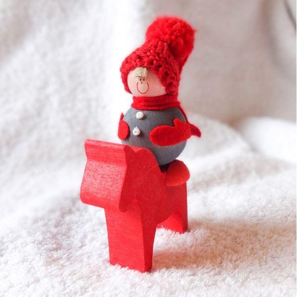 Handgemachtes Holz "Tonttu" auf einem Pferd. Grösse ca. 8cm. "Sirkka Tonttu"s werden seit 1975 mit liebe aus Naturmaterialien, wie Holz, Wolle und Leinen als Handarbeit hergestellt und deswegen ist jeder Tonttu ein Unikat.