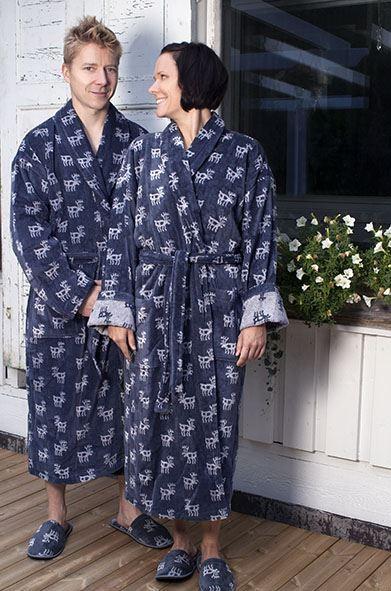 Kuscheliger Bademantel aus reinem Baumwollfrottee mit PORO (Rentier) Motiv, Gurt und 2 aufgesetzte Taschen von Erja Raittinen. In Grössen M, XL & XXXL erhältlich. Farbe dunkelgrau-hellgrau.