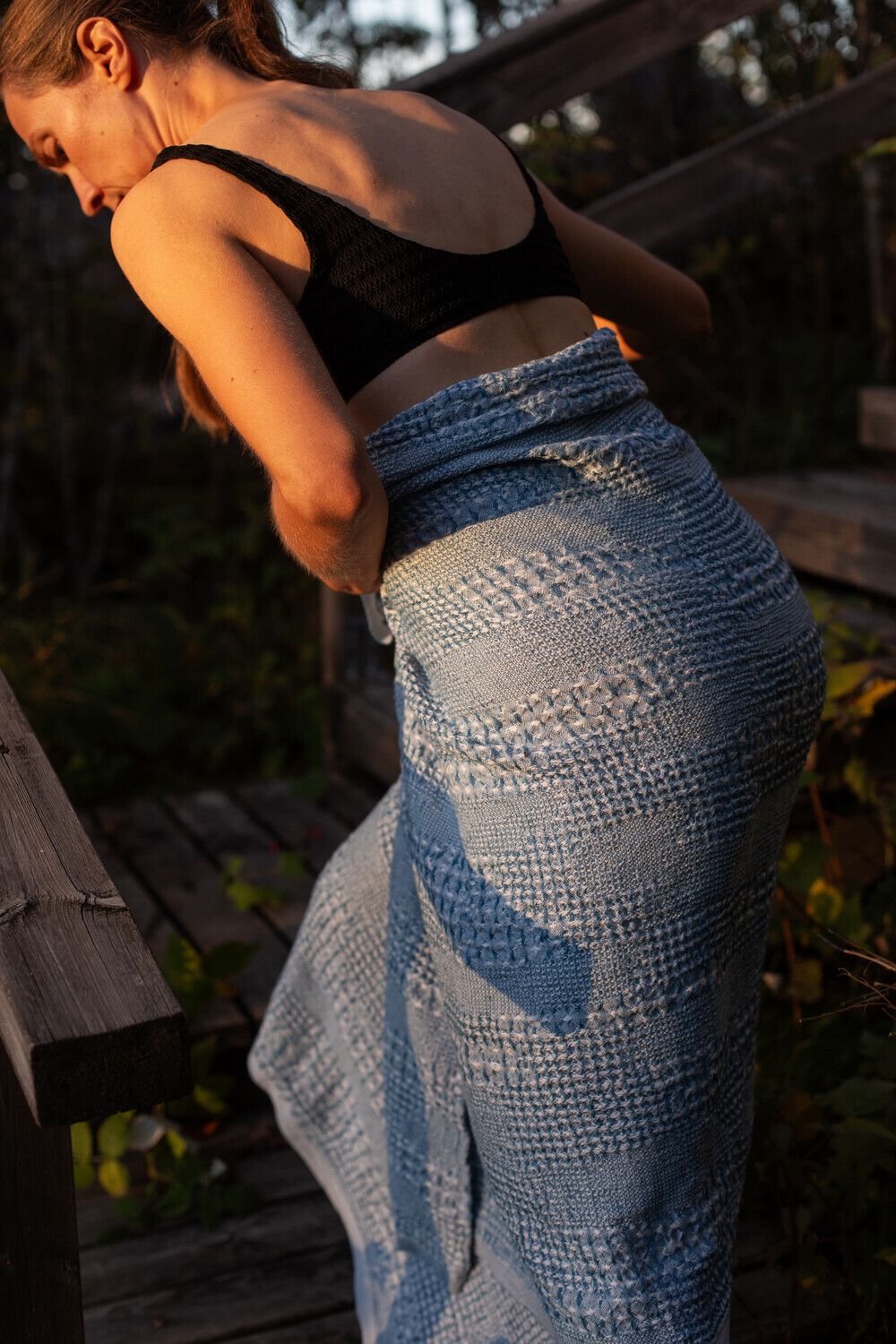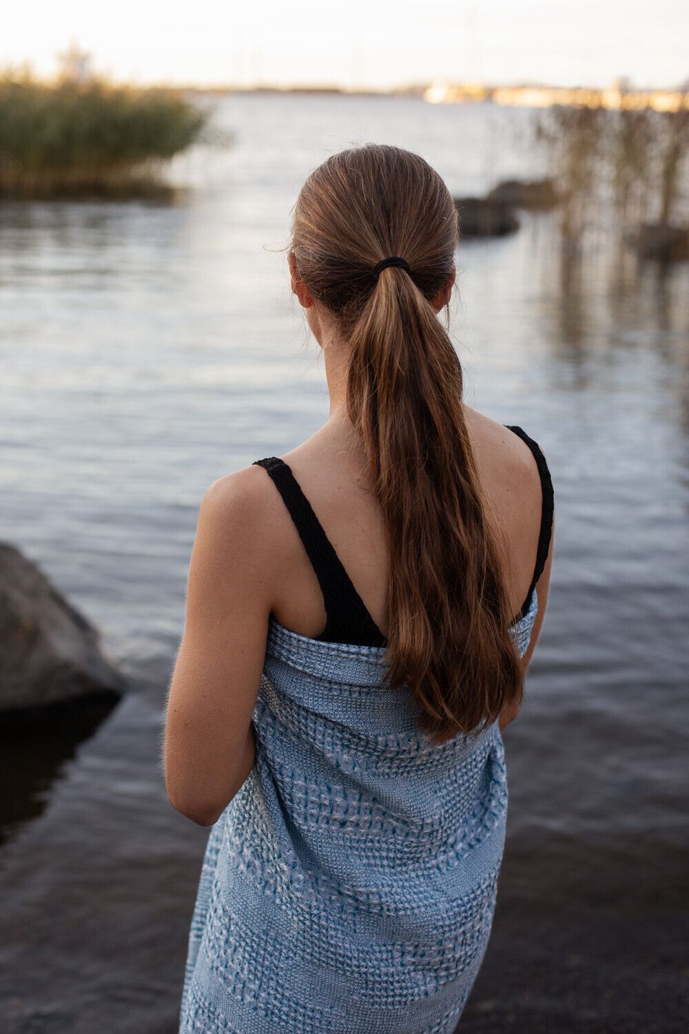 Produktentwicklung, Materialeinkauf, Programmierung von Webstühlen und Design sowie Schärung, Weberei, Veredelung und Stoffinspektion erfolgen in Lapua in unserer eigenen Weberei. Das Nähen erfolgt hauptsächlich in unserem eigenen Tochter-Nähbetrieb in Litauen oder unserer eigenen Weberei in Lapua. Accessoires kommen aus Europa, hauptsächlich aus Finnland. Herkunftsland ist Finnland. Dieses leichte und schnell trocknende Handtuch ist eine praktische, schöne und ökologische Wahl.