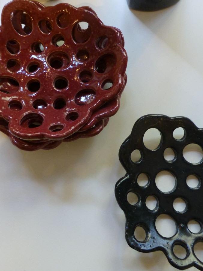 Handgefertigte Seifen Unterlage von Jenni Linnove. Durchmesser ca. 15 cm. In Farben weinrot und schwarz.