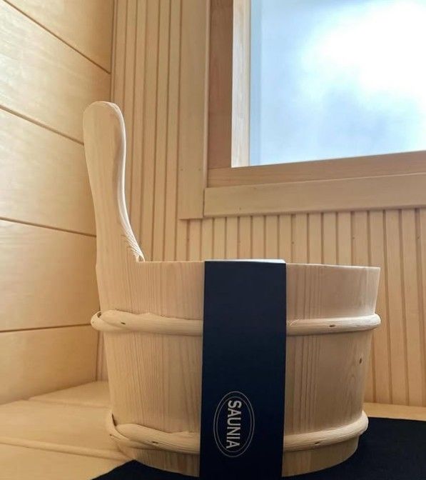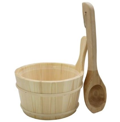 Das traditionelle Sauna-Set besteht aus Saunakübel und Kelle aus Kiefern-holz