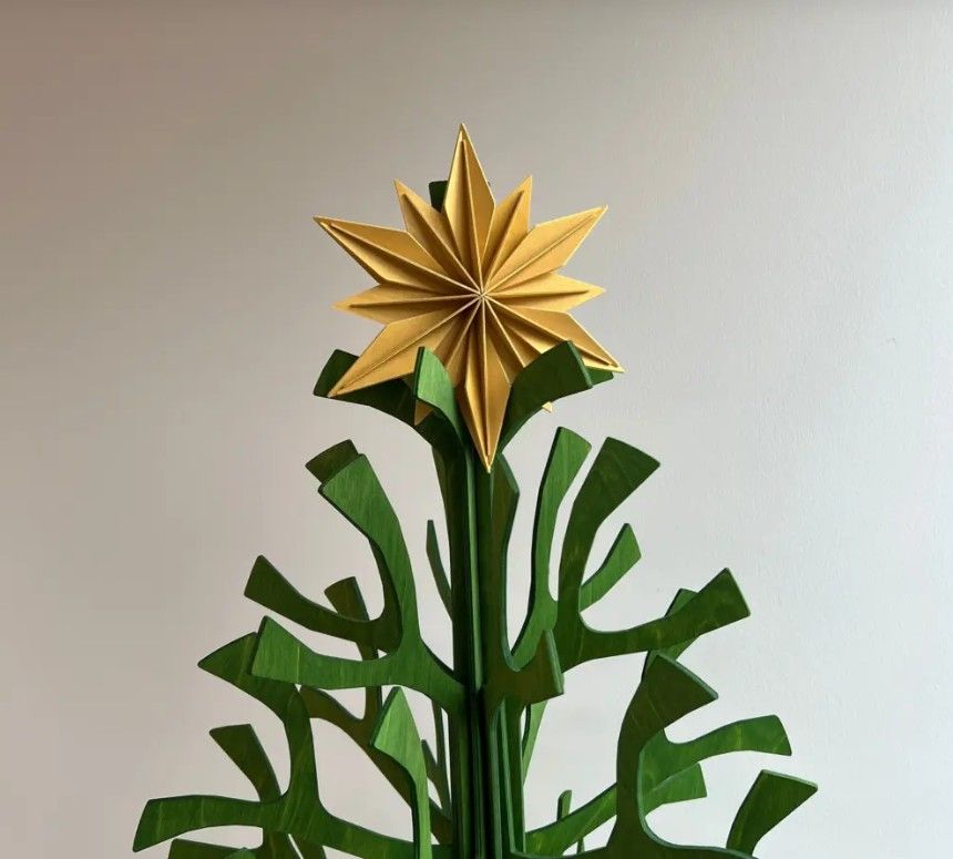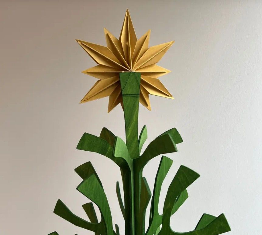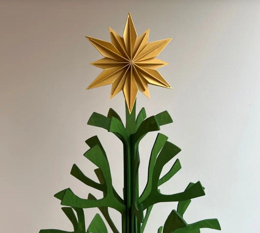 Die Sternform basiert auf Lovis patentierter Konstruktion. Durchdachte Aussparungen und Kerben ermöglichen das Zusammenfügen der Teile ohne Klebstoff. Der Stern lässt sich zur einfachen Aufbewahrung auch wieder auseinandernehmen.