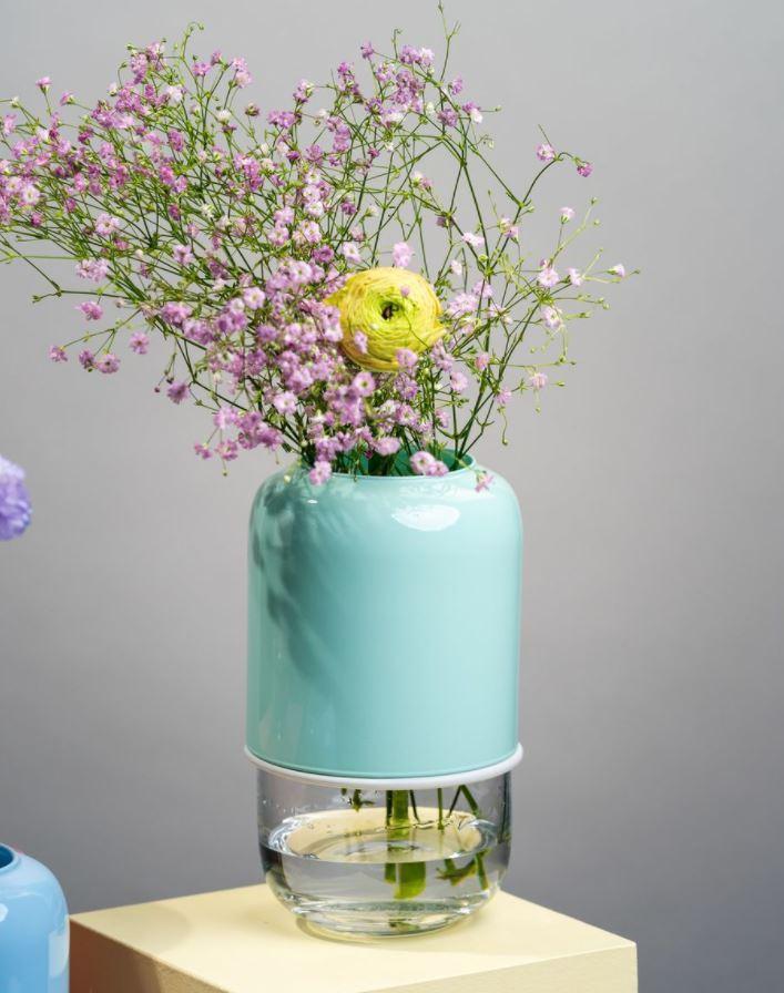 Die Kapsel ist das Ergebnis des "All in One" -Denkens in der Welt der Vasen. Inspiriert vom Happy-Design-Trend wurden sowohl fröhliche als auch intensive Farben als Farbwelten der Vasenteile ausgewählt, um das einfache, reduzierte und ausgewogene Ganze der Glasteile hervorzuheben. Die mundgeblasenen Glasteile der Kapsel sind durch einen dünnen Silikonring verbunden, der durch Bewegen auf der Oberfläche des unteren Glasteils die Höhe der Vase an Ihre jeweilige Zusammensetzung anpasst.