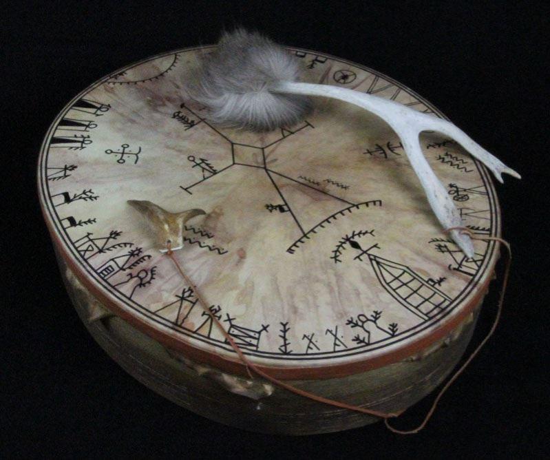 Ein traditioneller, grosser Trommel aus Rentierleder auf Holzgerüst mit original Zeichnungsmuster und Zeichnungsordnung von alten finnischen Schamanentrommeln. Mit Rentierhornknebel mit Rentierfell & kleiner Rentierhorn Stück in eine Rentierlederband befestigt. Mit "Terva" (mit wärme aus Birke gewonnener Saft mit Rauchduft) gefärbt und behandelt. Jeder Stuck ein Unikat. Grösse ca. 45cm Durchmesser.