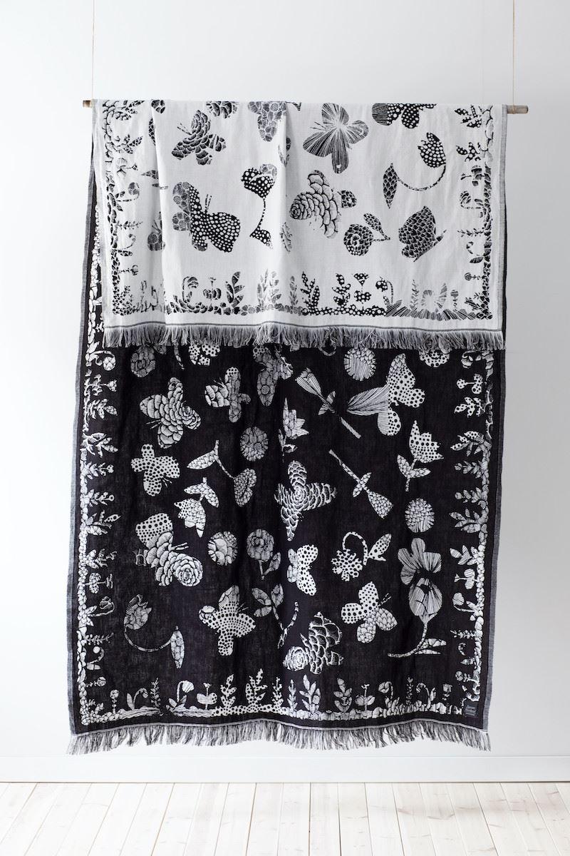 Gewobene Schwarz-Weisse Decke mit sommerlicher Schmetterling-Motiv, 140x240cm