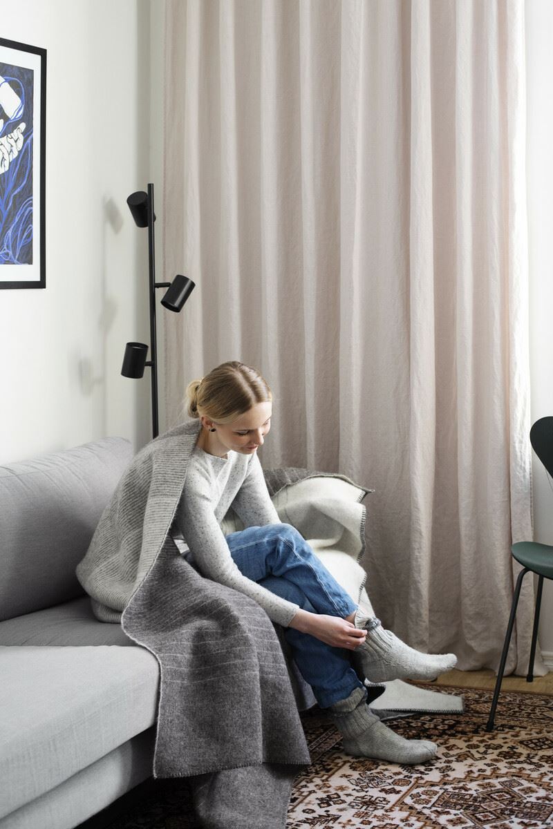 Die KAAMOS-Decke besteht aus einheimischer finnischer Schafswolle. Diese Decke wird in unserer eigenen Weberei gewebt und in unserer neuen Veredelungsfabrik in Lapua fertiggestellt.