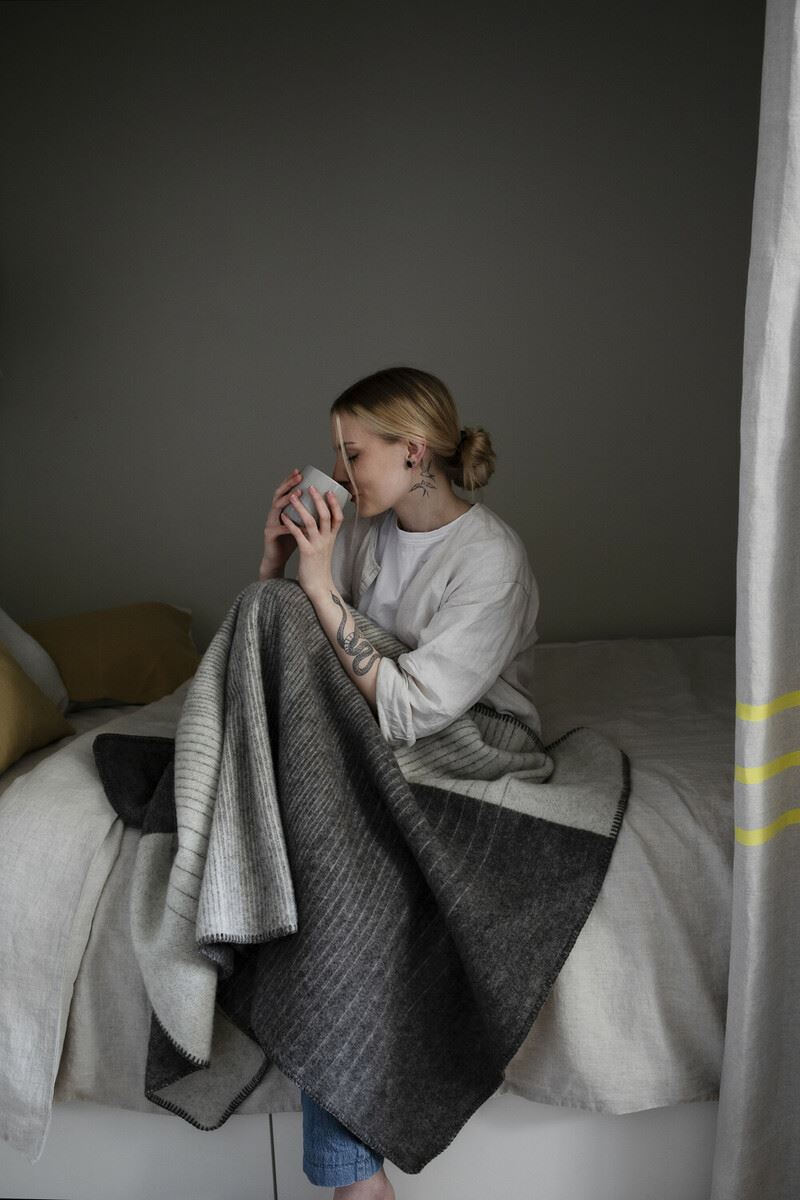 Diese schöne, weiche und warme Decke wurde von Hanna Galtat entworfen. Hannas Zusammenarbeit mit Lapuan Kankurit begann mit dem PatternLab-Projekt der Aalto-Universität. Die im Rahmen des Projekts entworfene KAAMOS-Decke wurde durch den täglichen Zyklus von Licht und Dunkelheit inspiriert.